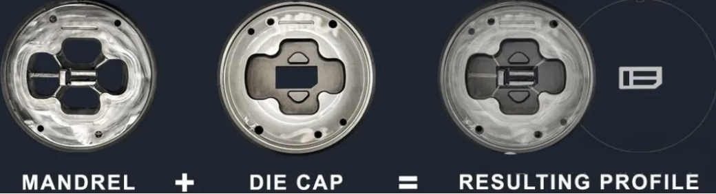 • Die: The die is the outer part of the die assembly, which holds the mandrel in place and shapes the outer contour of the aluminum profile. It has a contour that matches the desired external shape of the final product.
